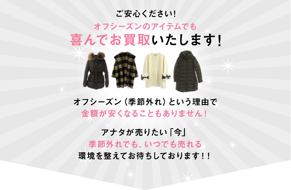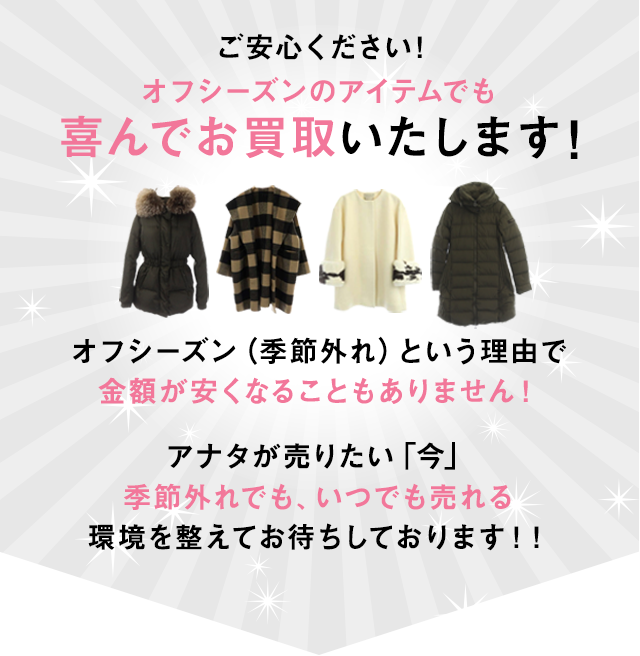 店舗販売のお店は特に、季節外れという理由でアイテムの買取をしてくれなかったり、「季節外れ」という理由で買取金額を安く見積るお店が存在しているので、 オフシーズン物でもきちんと買取してもらえるか心配なさるお客様が多いようです。